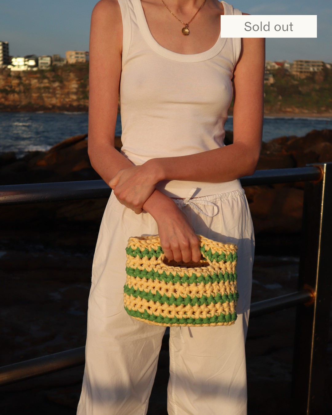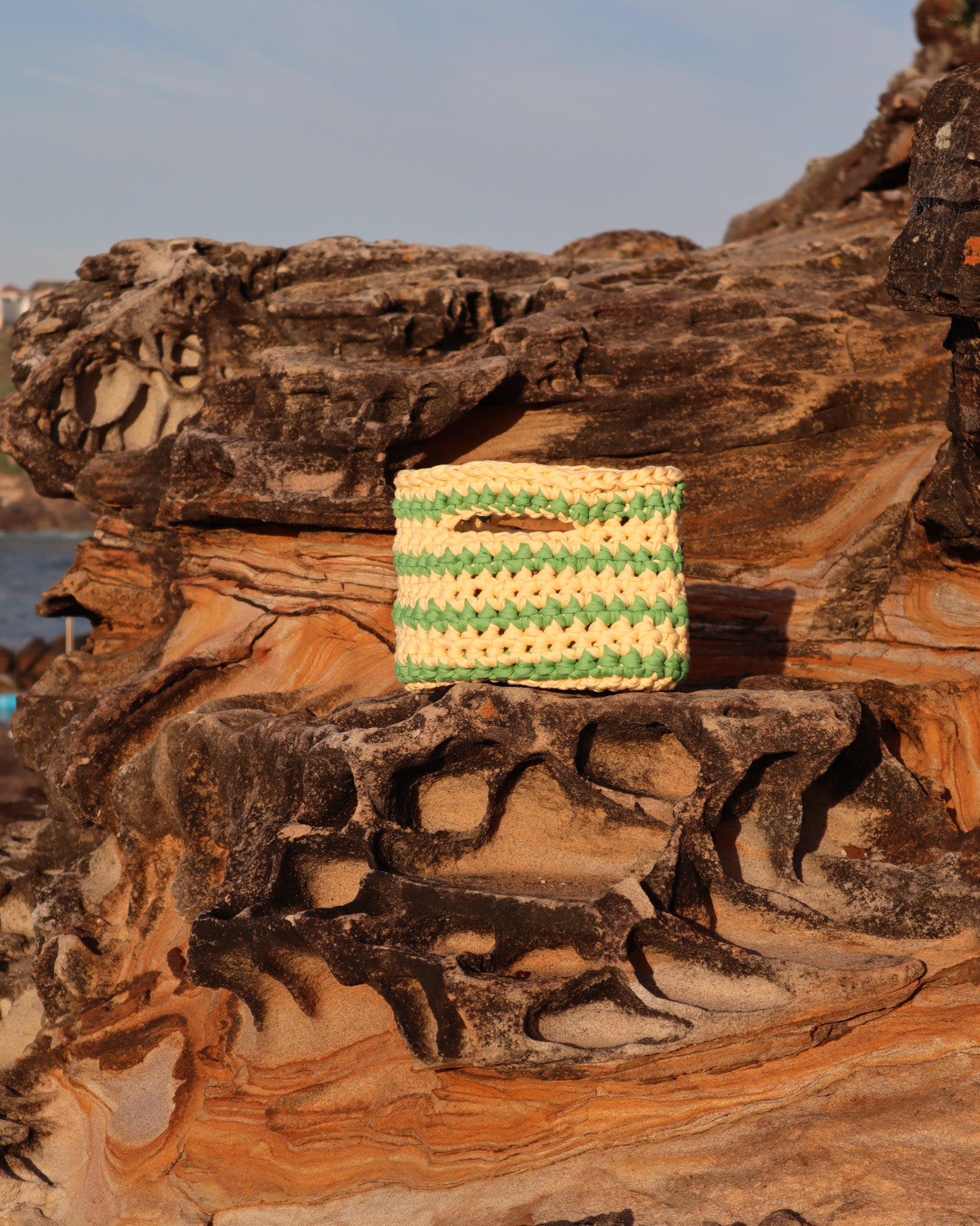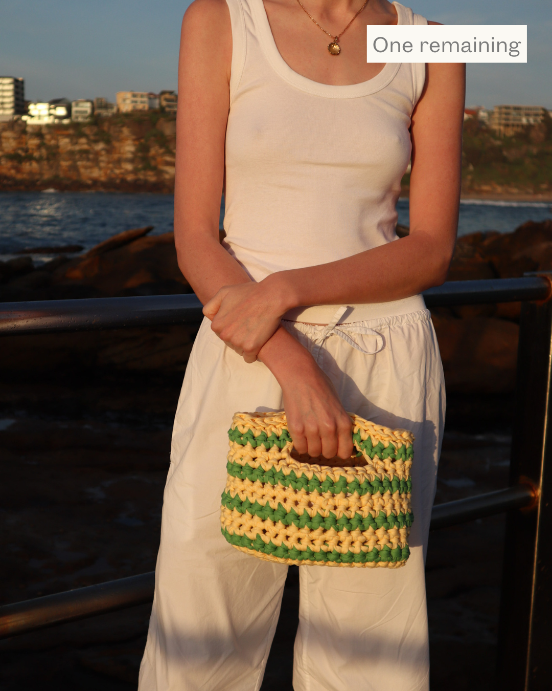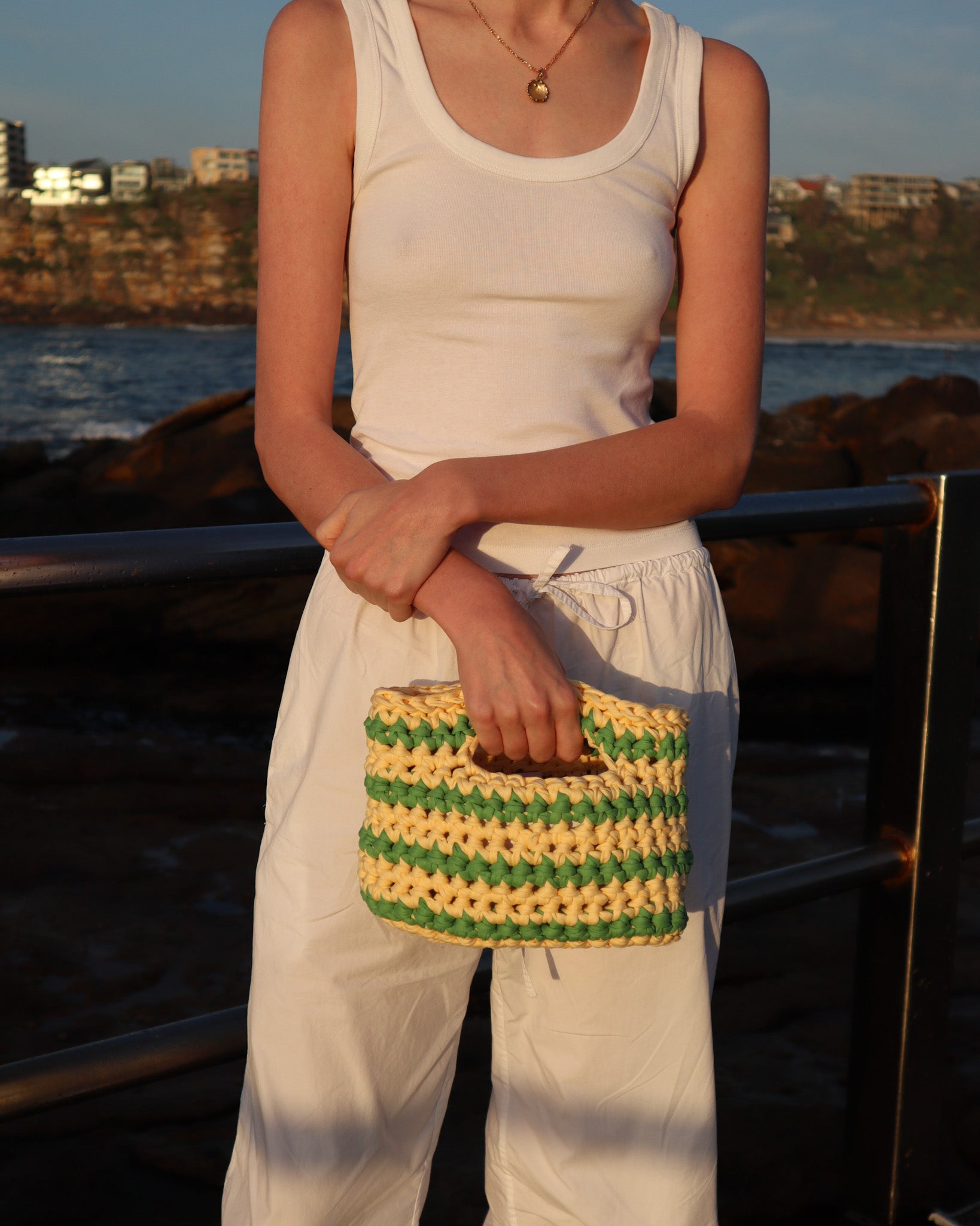 The striped bucket bag is handcrafted locally in Sydney. It’s made from a soft cotton yarn, featuring an easy to carry clutch style handle and a flat, oval base. It can sit on a table and fit all your essentials.