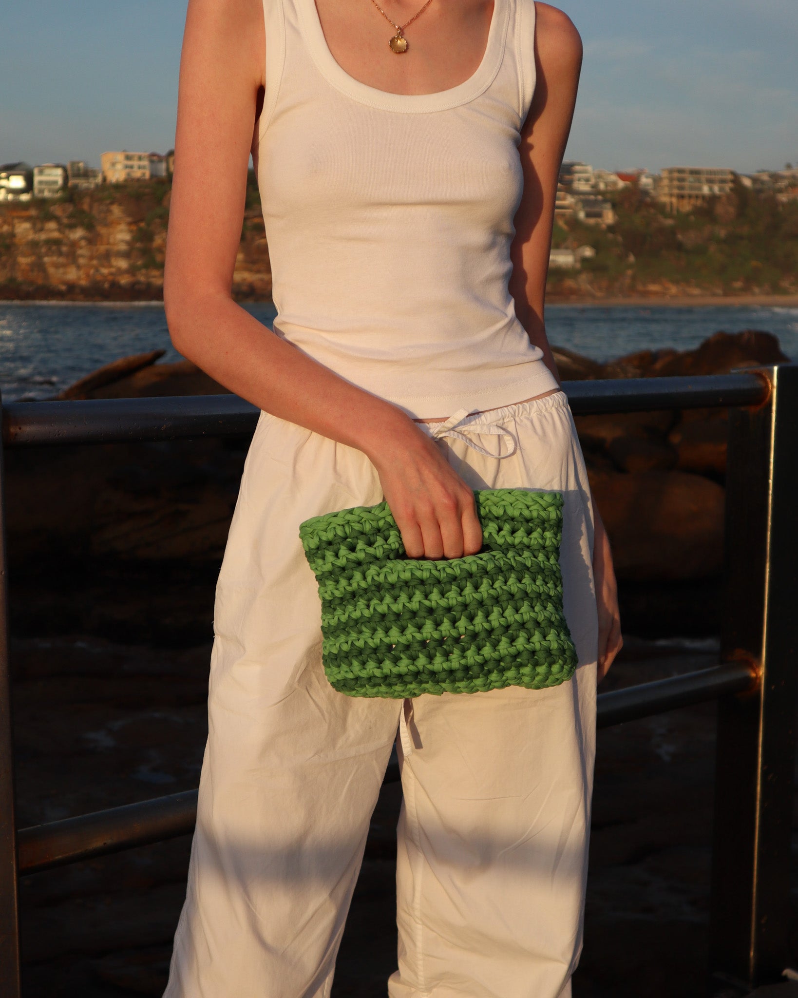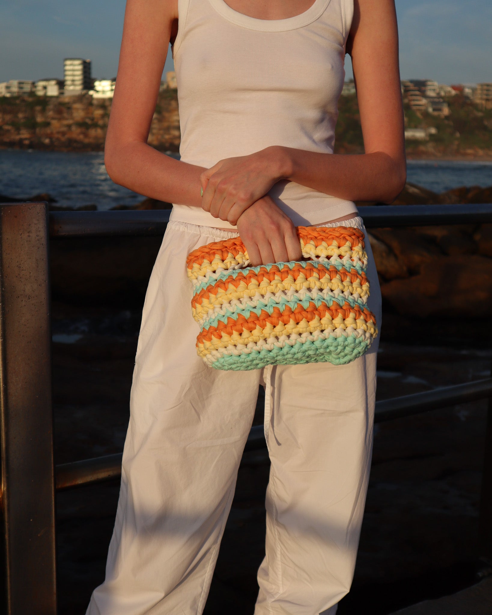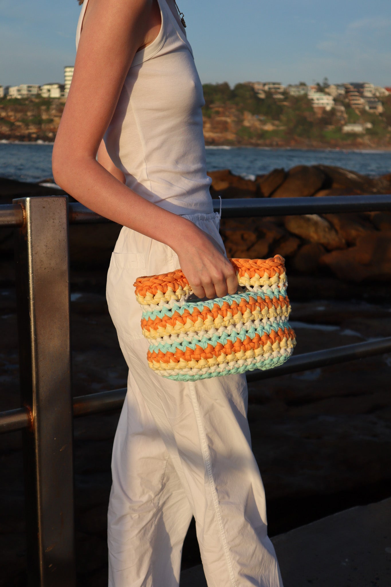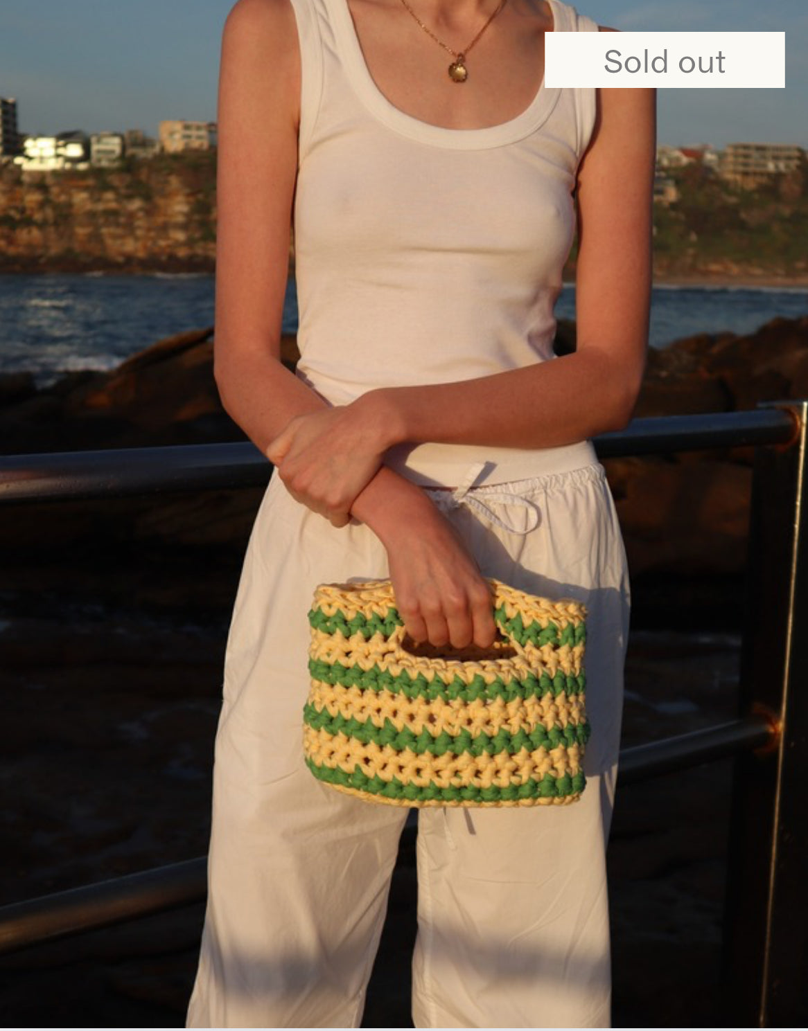 The striped bucket bag is handcrafted locally in Sydney. It’s made from a soft cotton yarn, featuring an easy to carry clutch style handle and a flat, oval base. It can sit on a table and fit all your essentials.